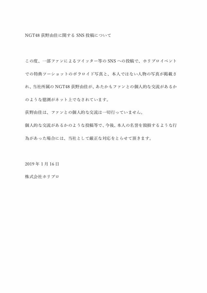 【速報】ホリプロ「荻野由佳はファンとの個人的な交流は一切行っていません。今後、本人の名誉を毀損するような場合は厳正に対応します」
